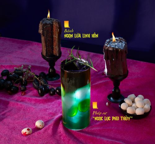 Cuối cùng là combo của "pháp sư" với ly trà xanh ma mị tựa độc dược và chiếc bánh nến đen tan chảy, mô phỏng một ngọn lửa linh hồn vĩnh cửu trong đêm tối.