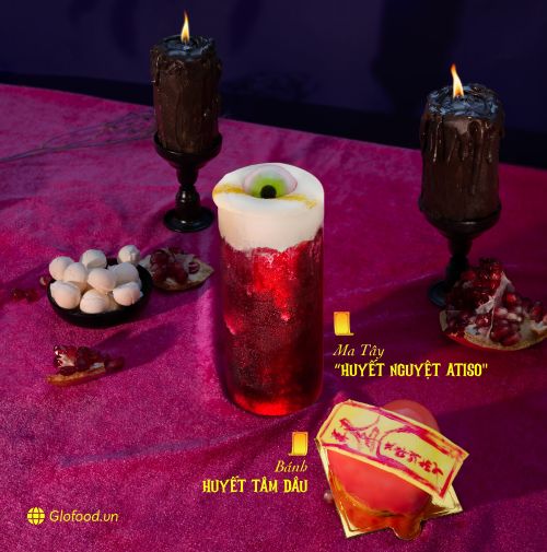 Mở đầu bằng một combo đỏ rực như máu, hoàn hảo cho bữa tiệc "ma tây" với ly trà "mắt quỷ" ghê rợn và chiếc bánh mousse phủ bóng tựa trái tim đang tan chảy.